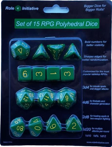 Role 4 Initiative: Polyhedral 15 Dice Set: Opaque Dark Green with Gold Numbers