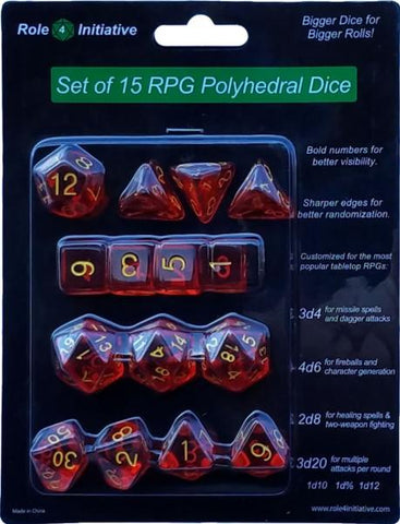 Role 4 Initiative: Polyhedral 15 Dice Set: Translucent Red with Gold Numbers