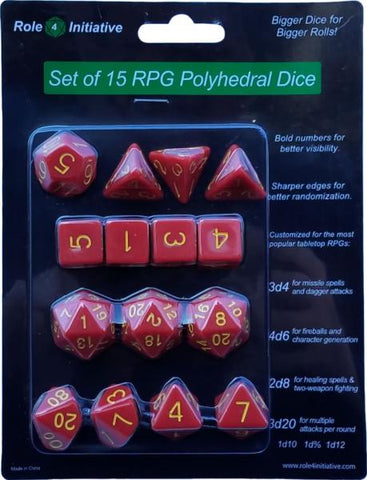 Role 4 Initiative: Polyhedral 15 Dice Set: Opaque Red with Gold Numbers