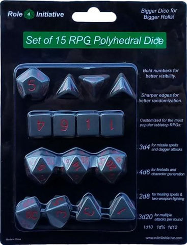 Role 4 Initiative: Polyhedral 15 Dice Set: Opaque Dark Gray with Red Numbers